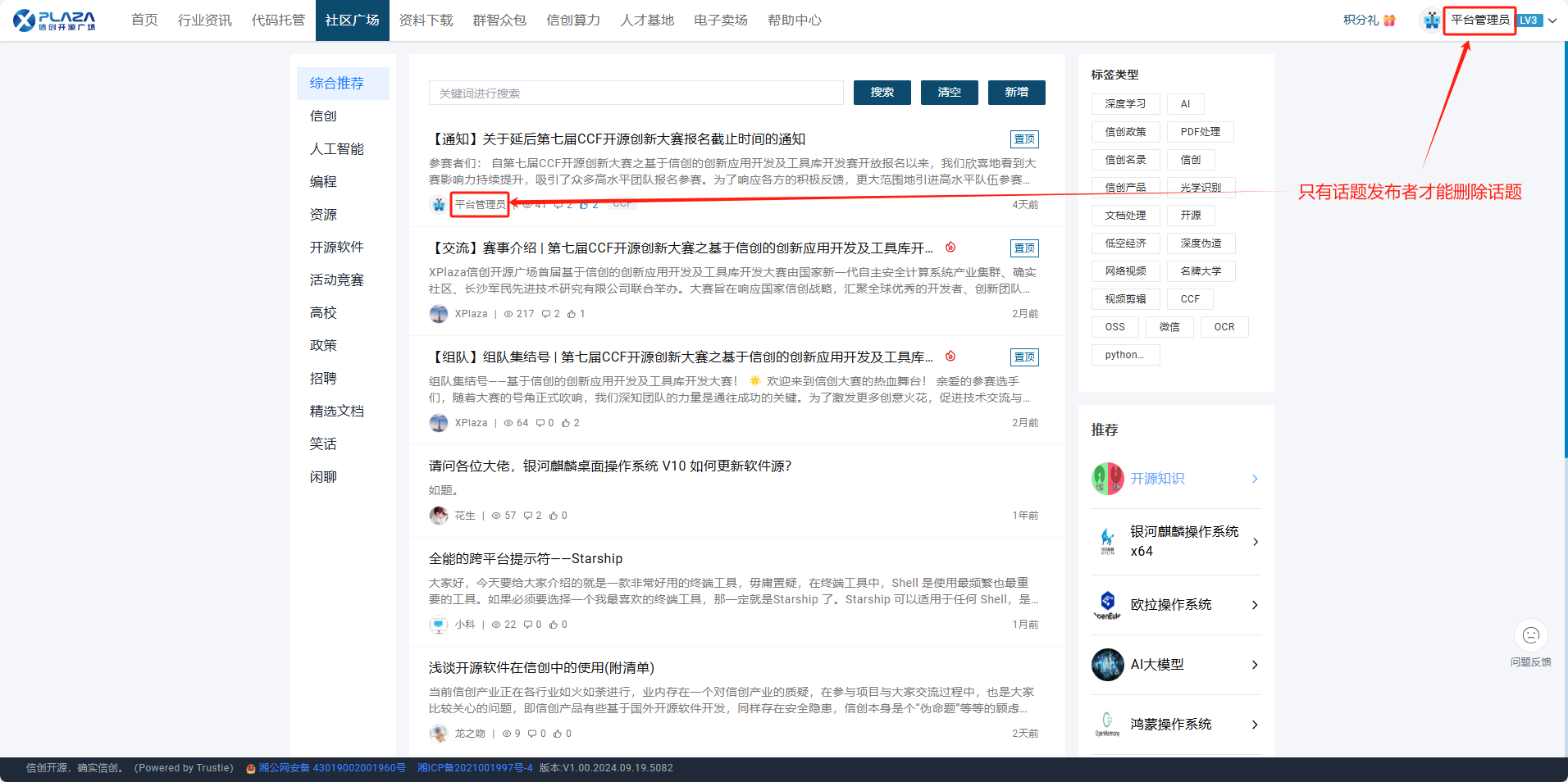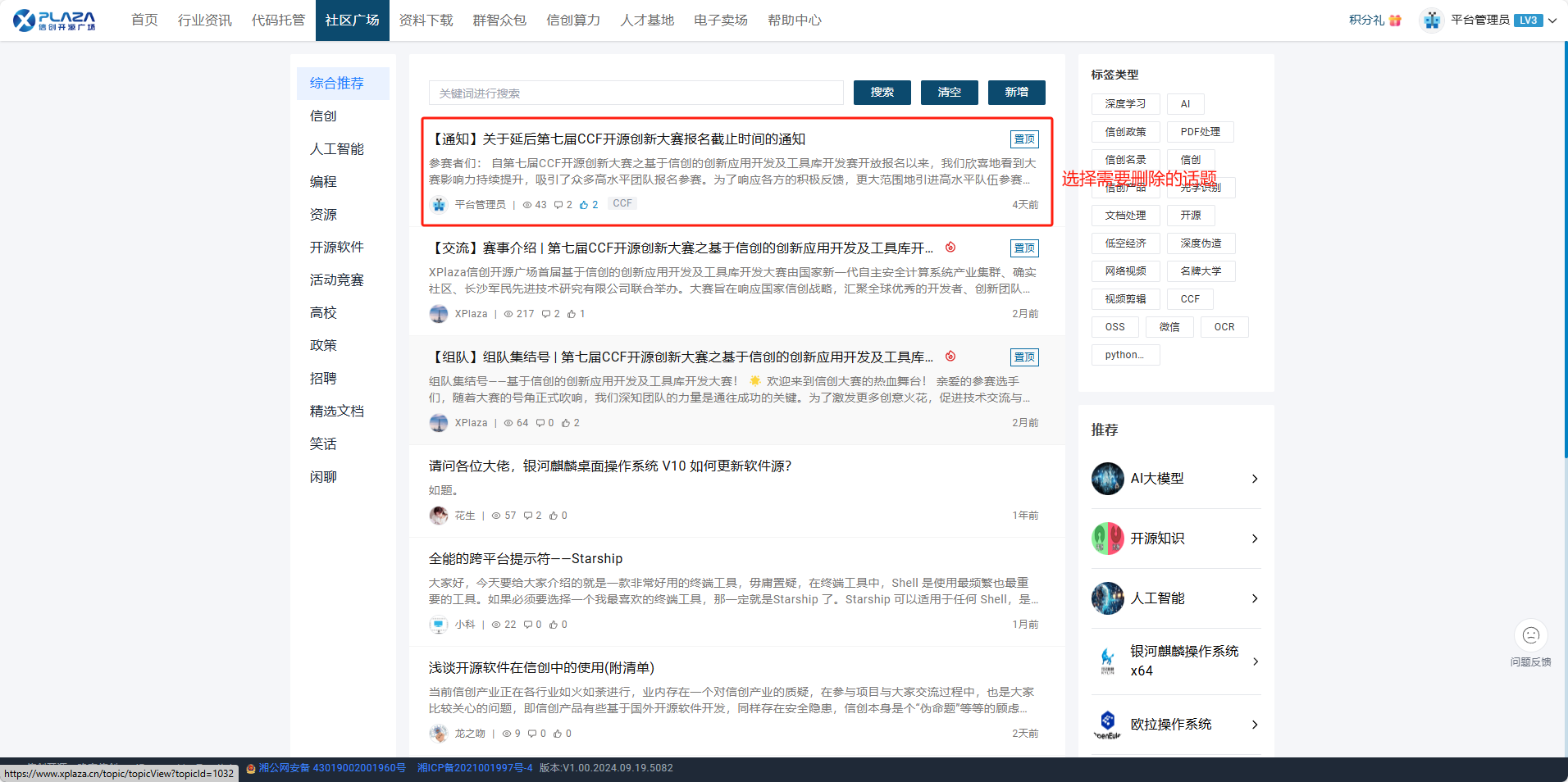 提交主题删除功能是平台允许用户在平台上删除自己发布的话题的功能。用户可以使用该功能来删除不再需要的话题或者错误的话题,从而保持话题列表的整洁和准确性。下面描述操作流程。