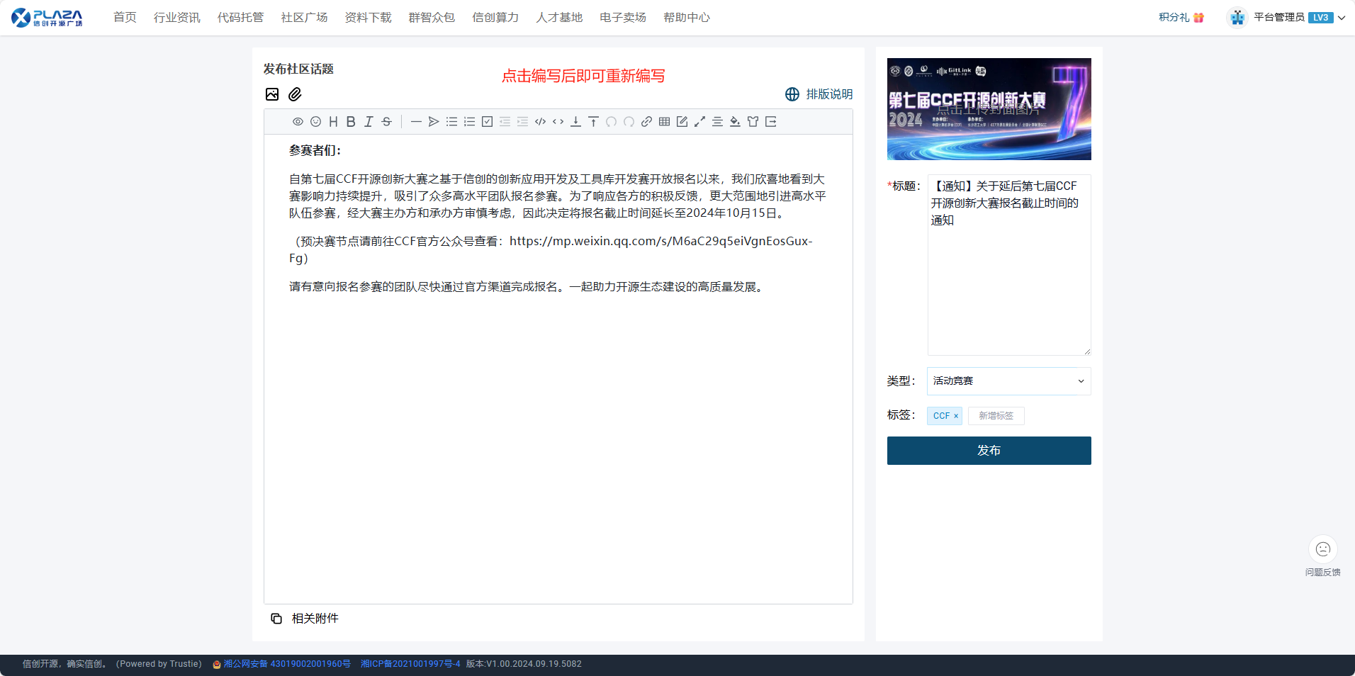 提交主题重新编译功能是平台允许用户在平台上重新编辑已发布的话题的功能。用户可以使用该功能来修改话题的标题、描述、标签等信息,从而更好地满足讨论的需求。下面描述操作流程。