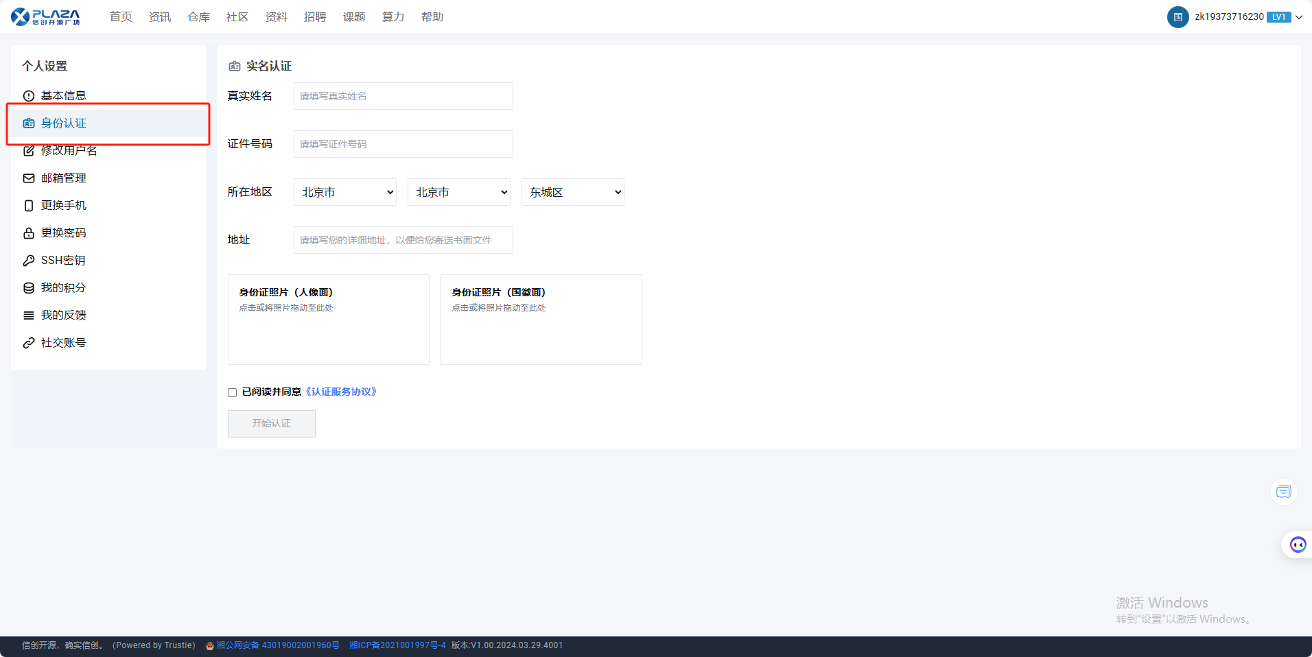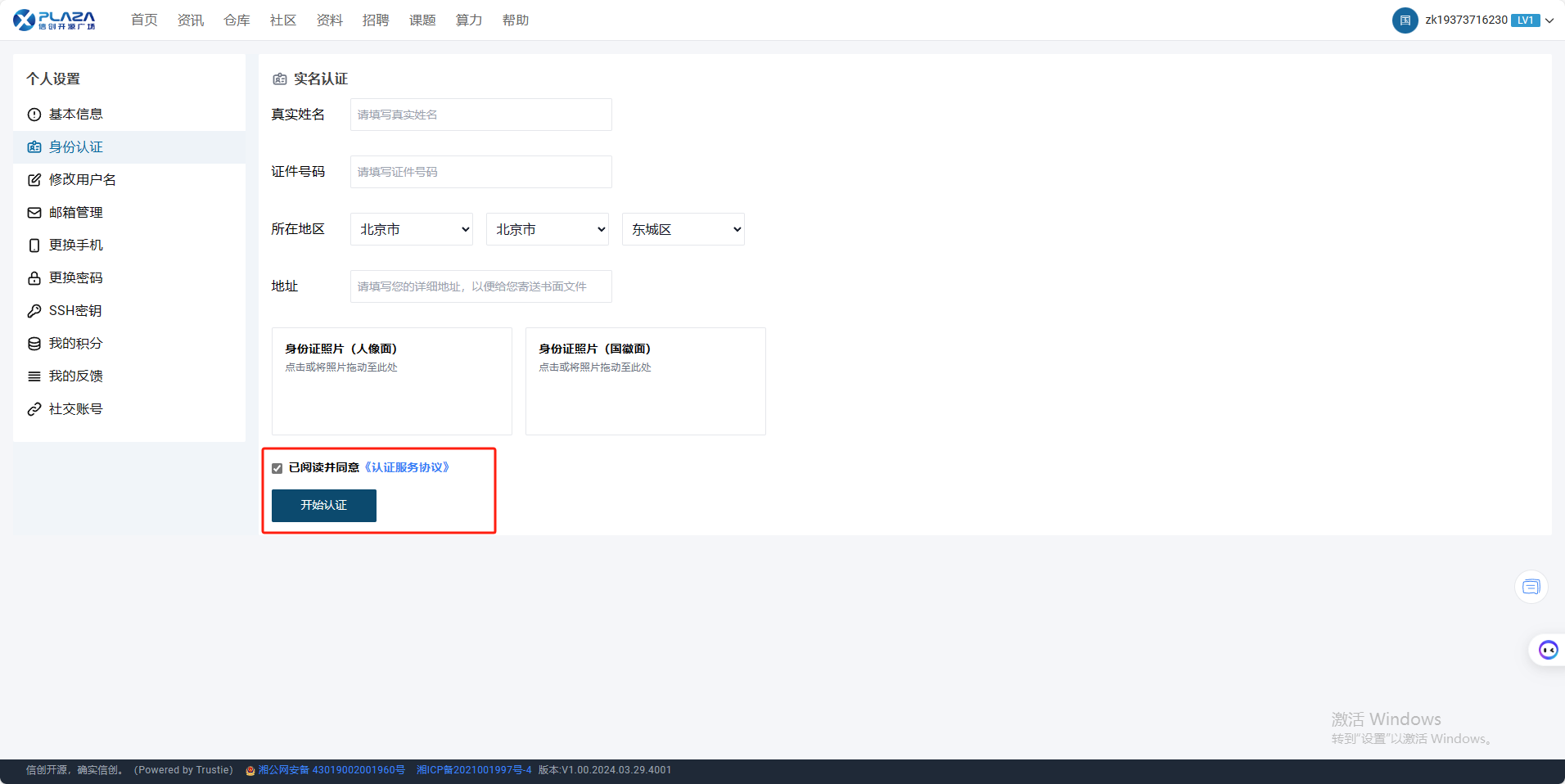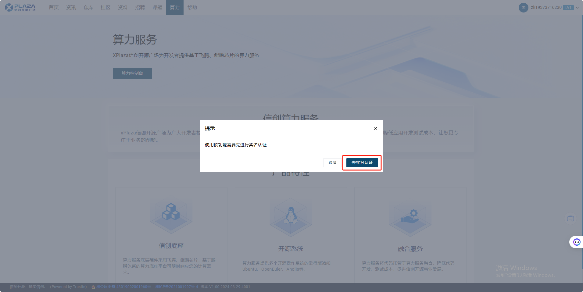 实名认证功能是系统的一项身份验证服务,用户可以通过该功能完成个人身份信息的提交与核实。实名认证有助于提升账户安全性,确保用户在使用系统算力服务时的合法性和真实性。下面描述该功能操作流程。
