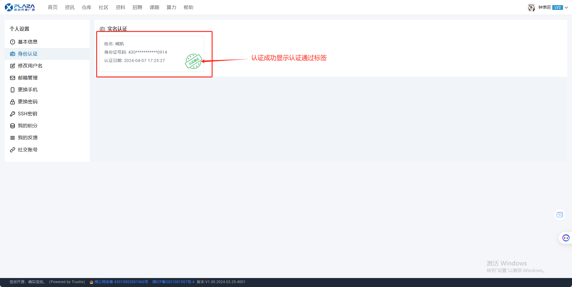 5.系统检验认证信息。认证成功,在【身份认证】显示认证通过,认证失败,页面返回失败原因。