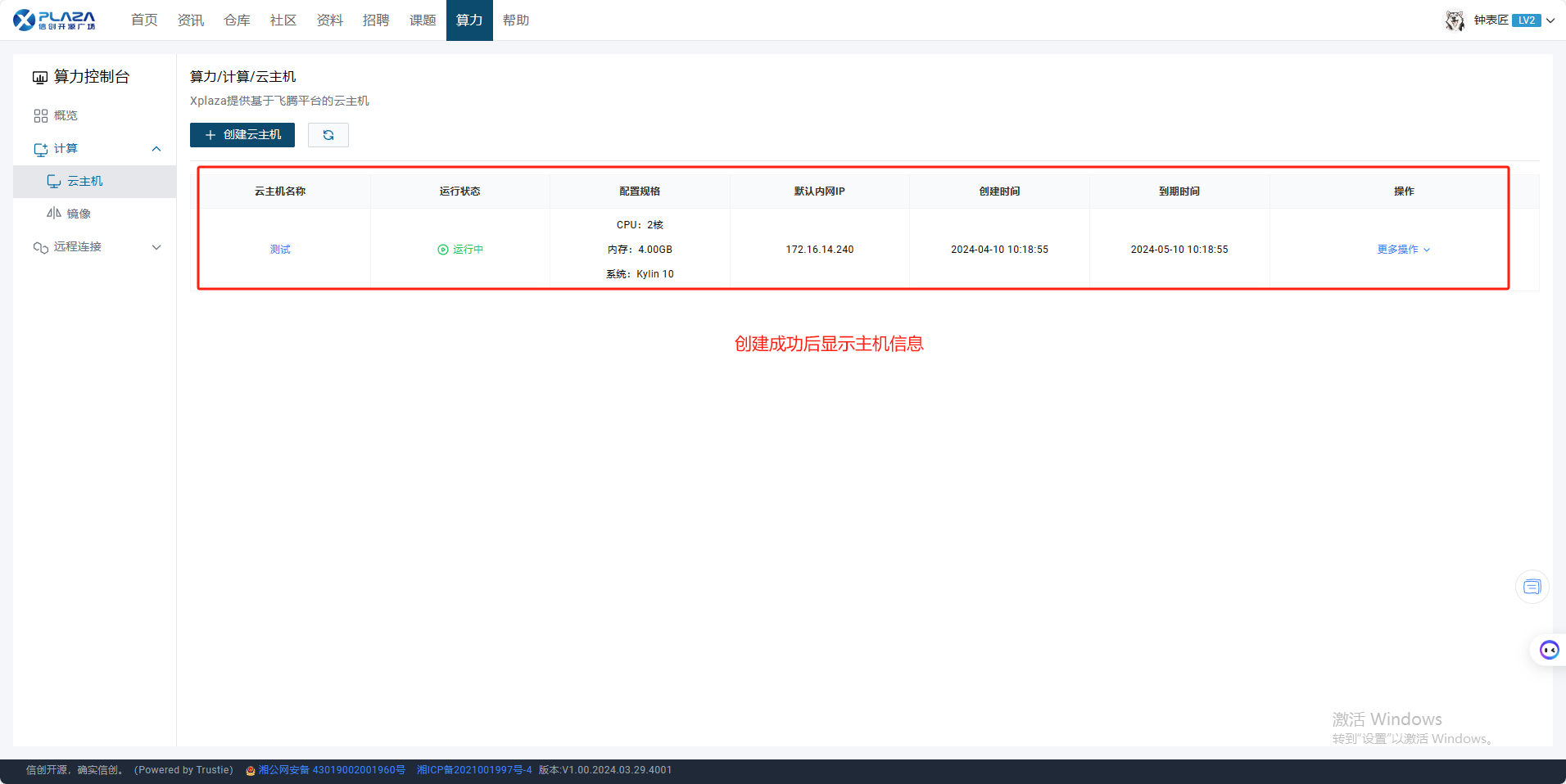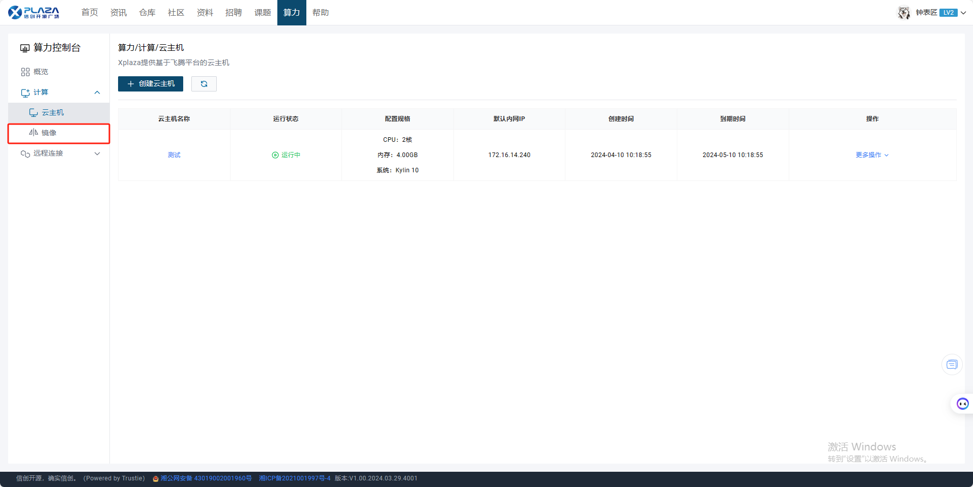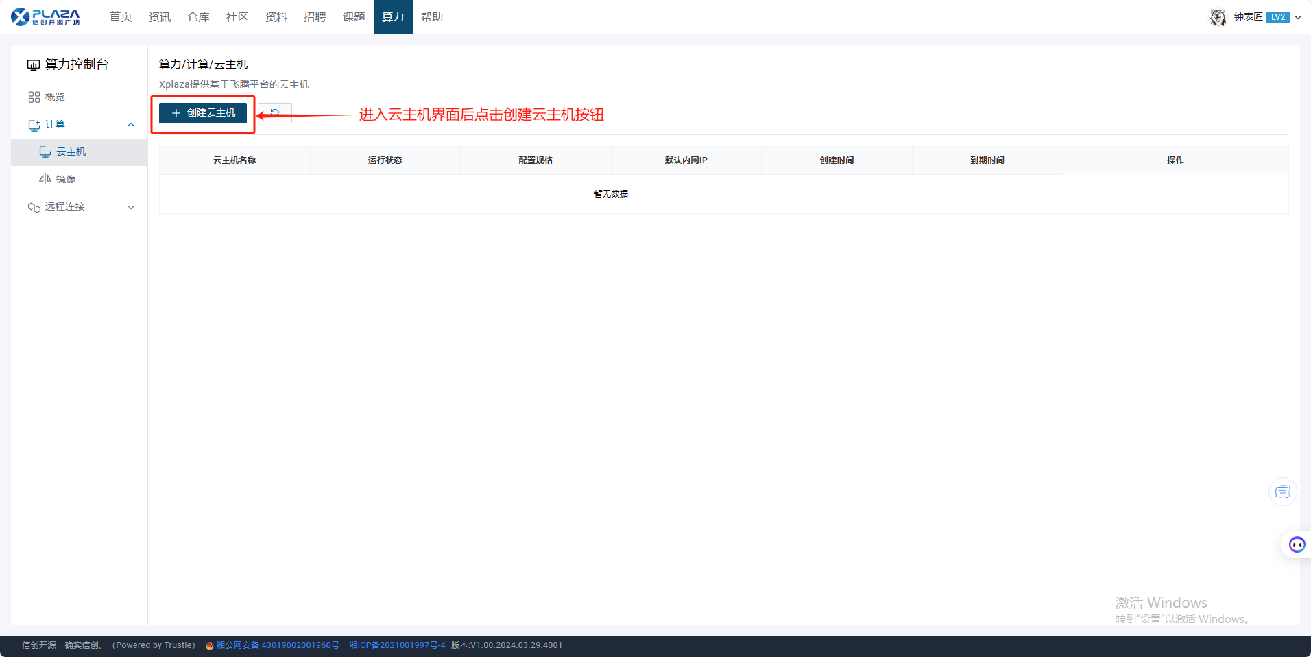 1.用户进入算力控制台页面,点击【计算】,点击【云主机】。