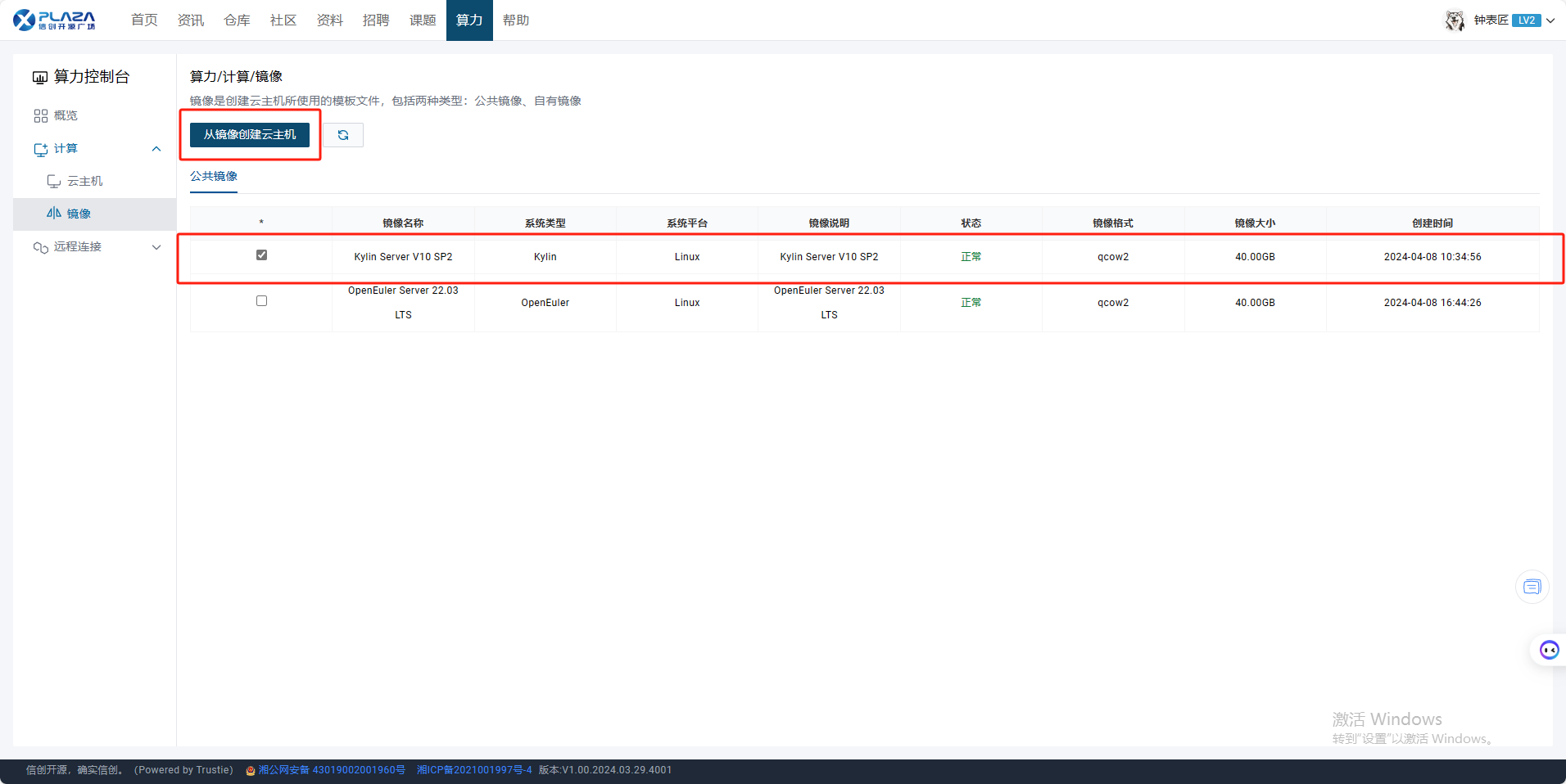 1.用户进入算力控制台页面,点击【计算】,点击【镜像】。