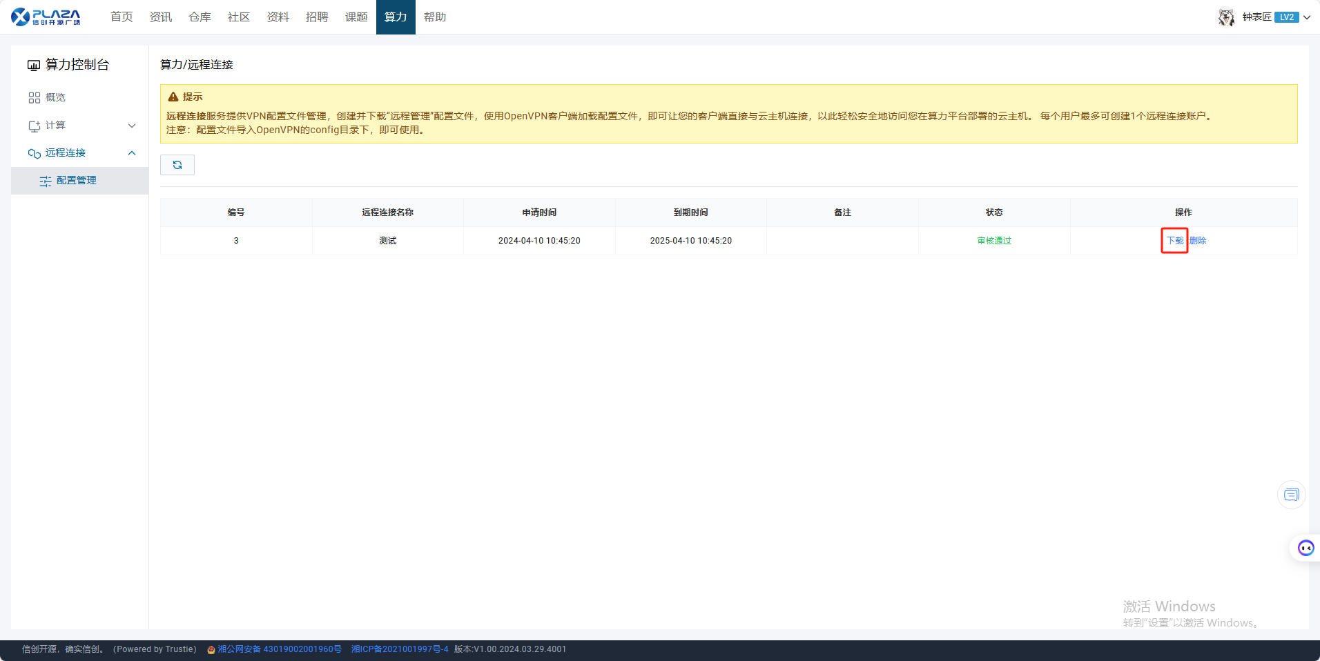 配置管理功能是算力控制台中的一项服务,它允许用户远程连接服务提供 VPN 配置文件管理,创建并下载“远程管理”配置文件,用户可以让客户端直接直接与云主机连接,以此轻松安全地访问您在算力平台部署的云主机。下面描述该功能操作流程。