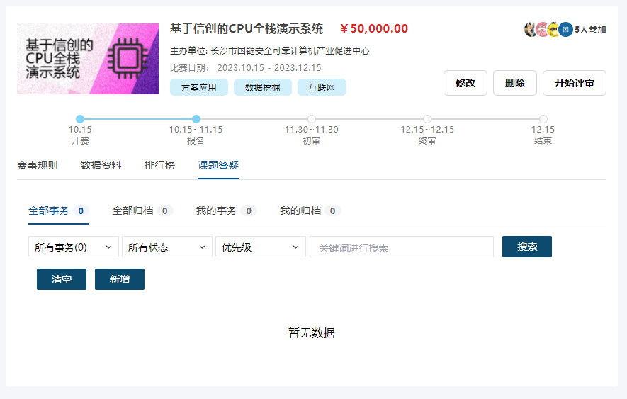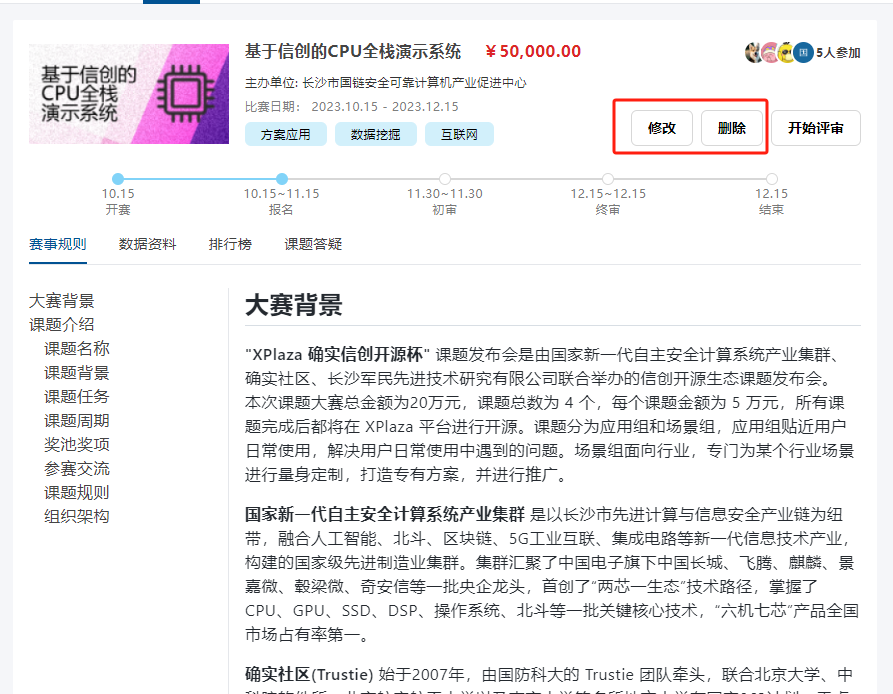 修改和删除课题,修改课题只修改课题基础信息与赛制规则,数据资料直接在课题详情页面的操作就可以了