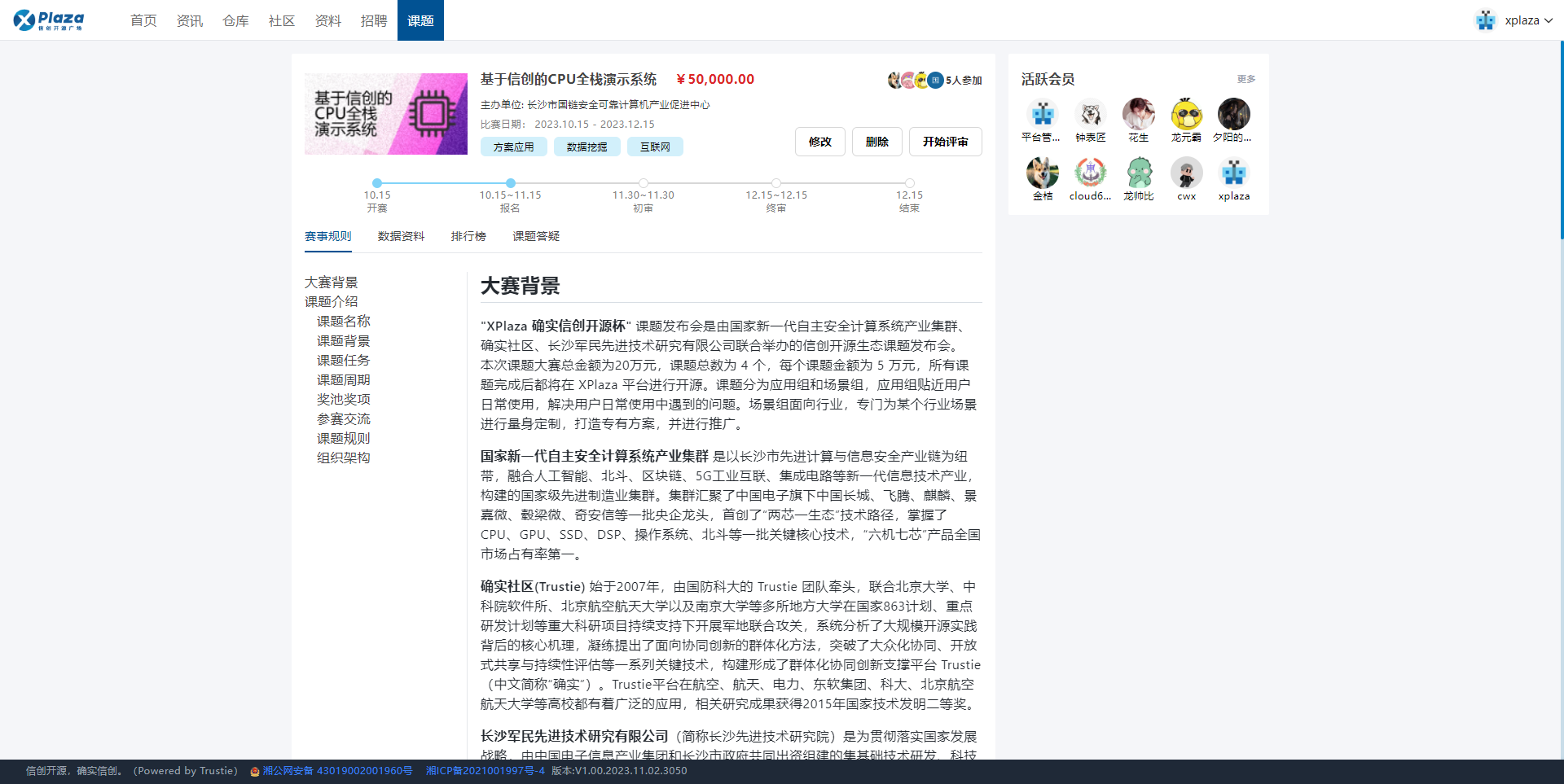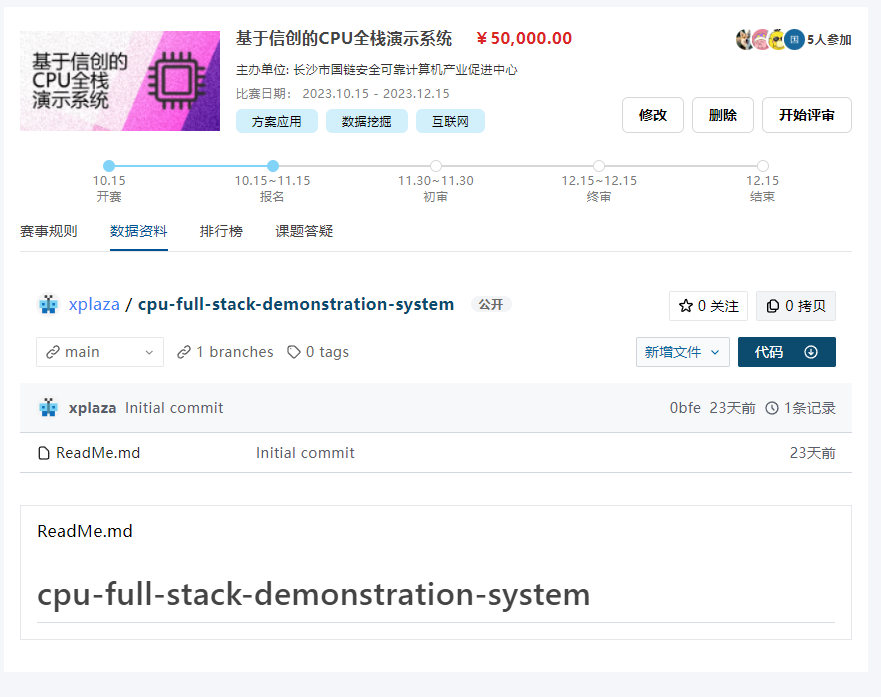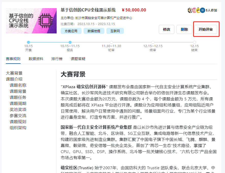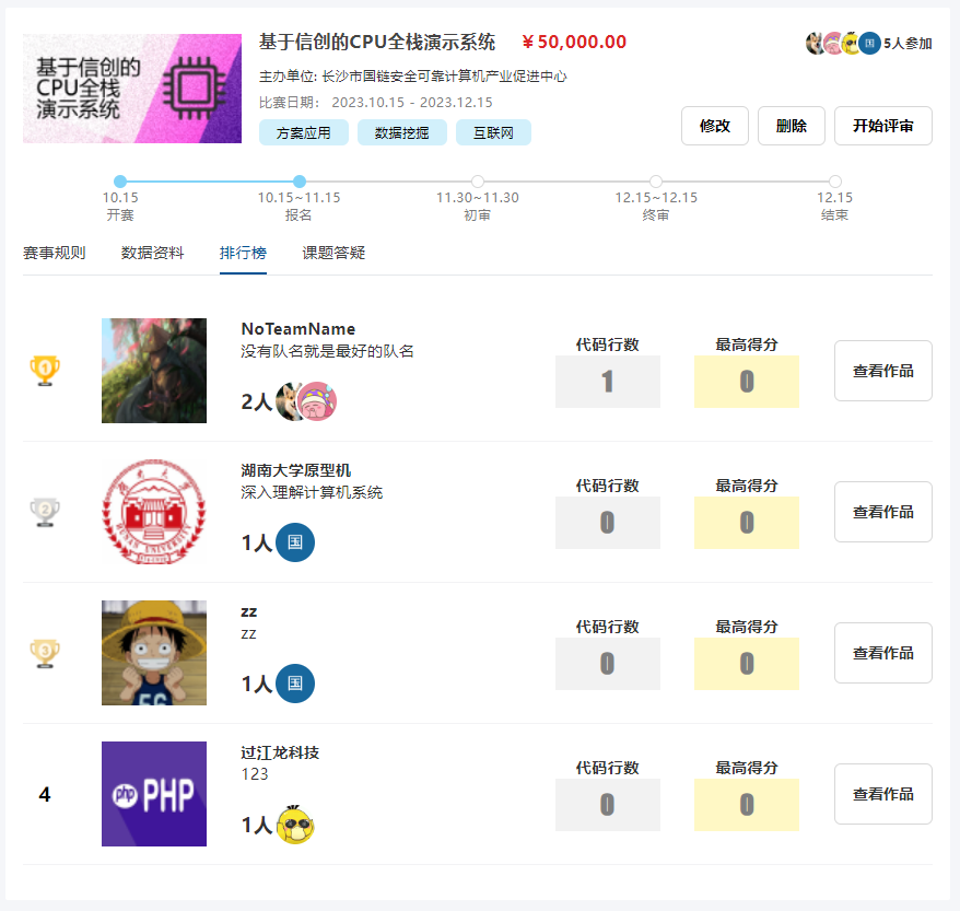 在课题进入到评审阶段时,主办方在课题详情页面进入评审和退出评审阶段。进入评审后,就可以在排行榜里面对每一个团队的作品进行评审以及对团队进行评分