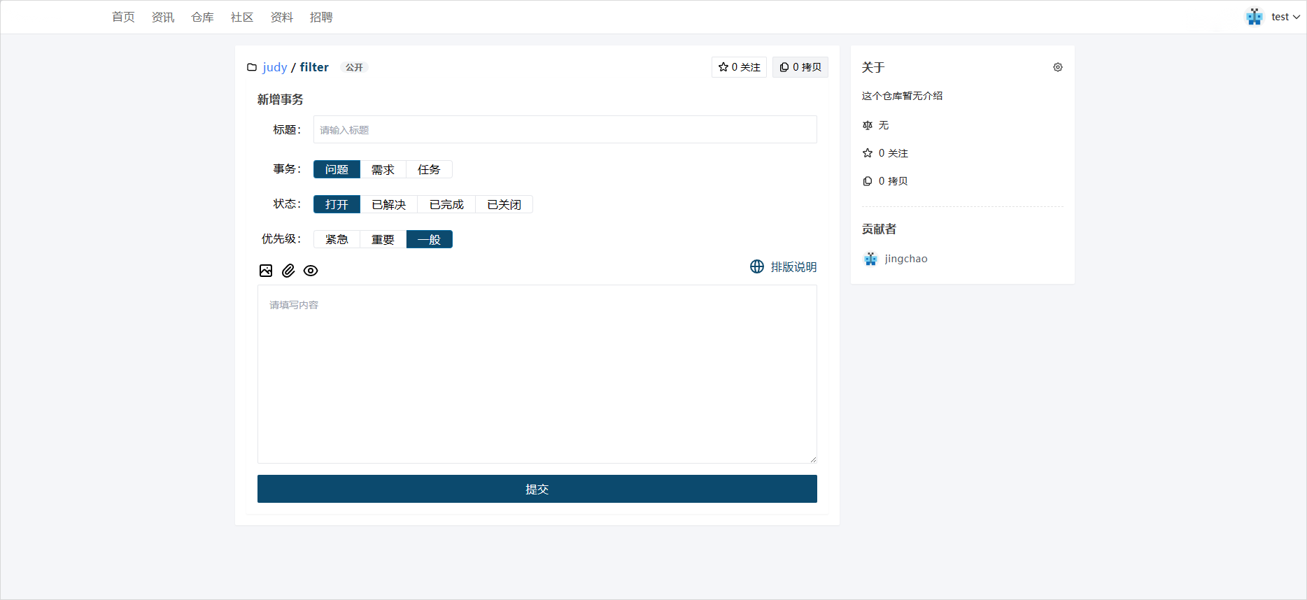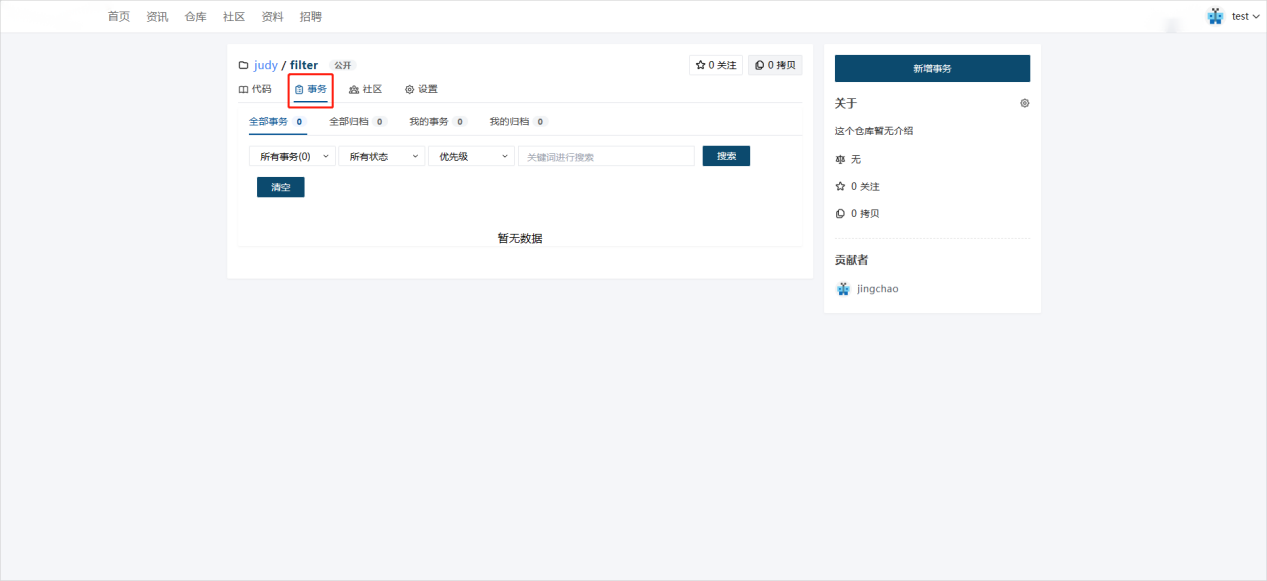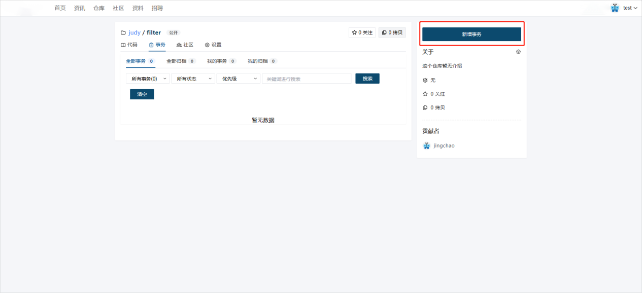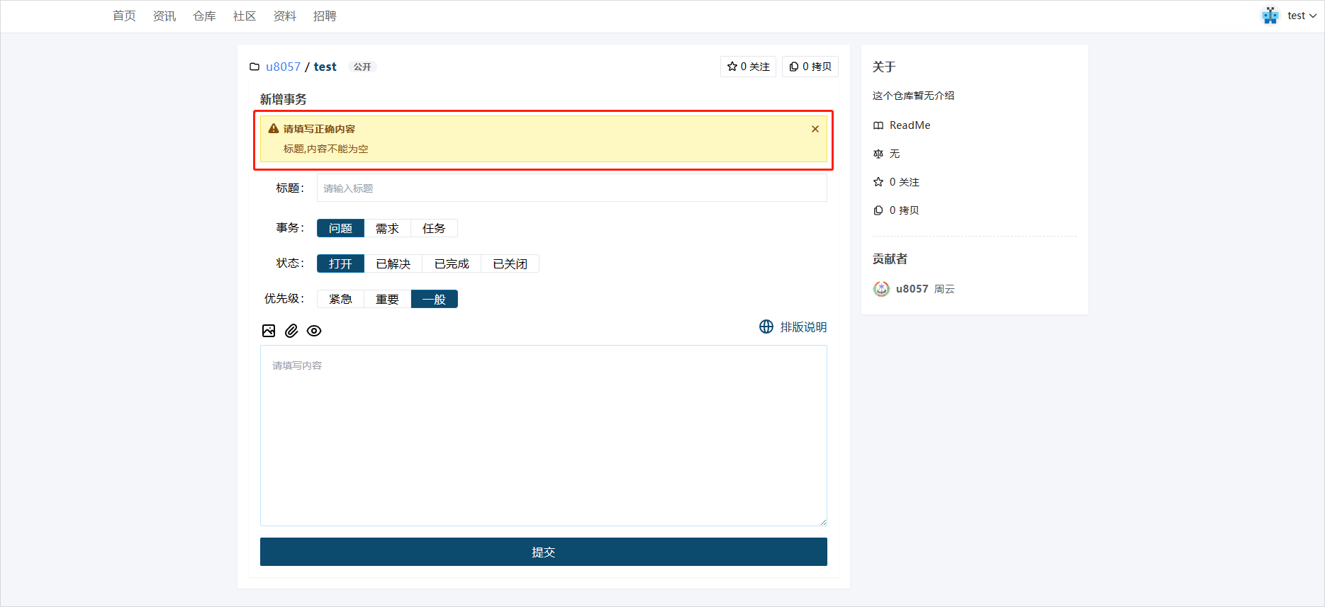 - 填写事务信息,事务执行人默认为仓库建立者,点击【提交事务】。
