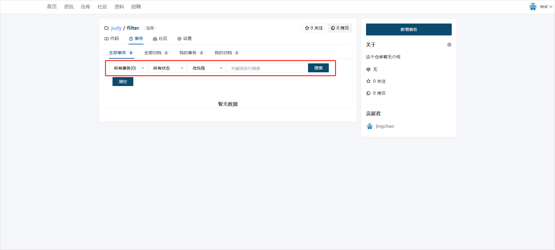 仓库事务功能是一种允许用户在代码仓库中报告和跟踪Bug的功能。通过这个功能,用户可以将发现的Bug提交到仓库中,并跟踪其处理过程,直到Bug得到解决。下面将以图文的形式描述该功能操作流程。